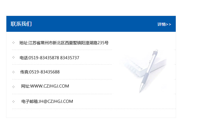 地址:常州市新北區(qū)友邦商務大廈1幢16、17層  電話:0519-85101652  傳真:0519-85112595  郵編:213022  網(wǎng)址:www_cz-jiayue_cn.fanchicn.com  郵箱:xiajifengaa@163.com
